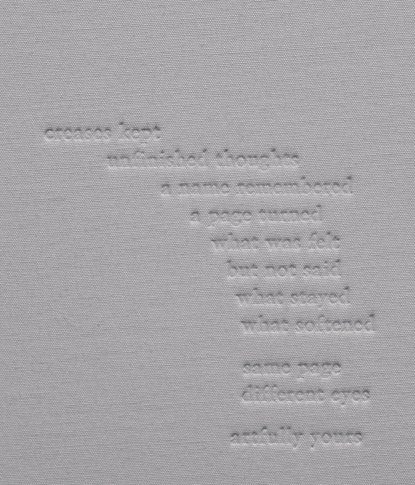 Handle gently. The foil will lift even from light scratching and daily use. The fabric cover will soften and may fray at edges over time. Store away from rough surfaces if you want to slow foil wear. Or don’t. Let it age at its own pace.
